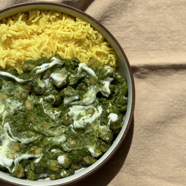 For serving, add rice and spinach chickpea mixture to a bowl and top with vegan yogurt